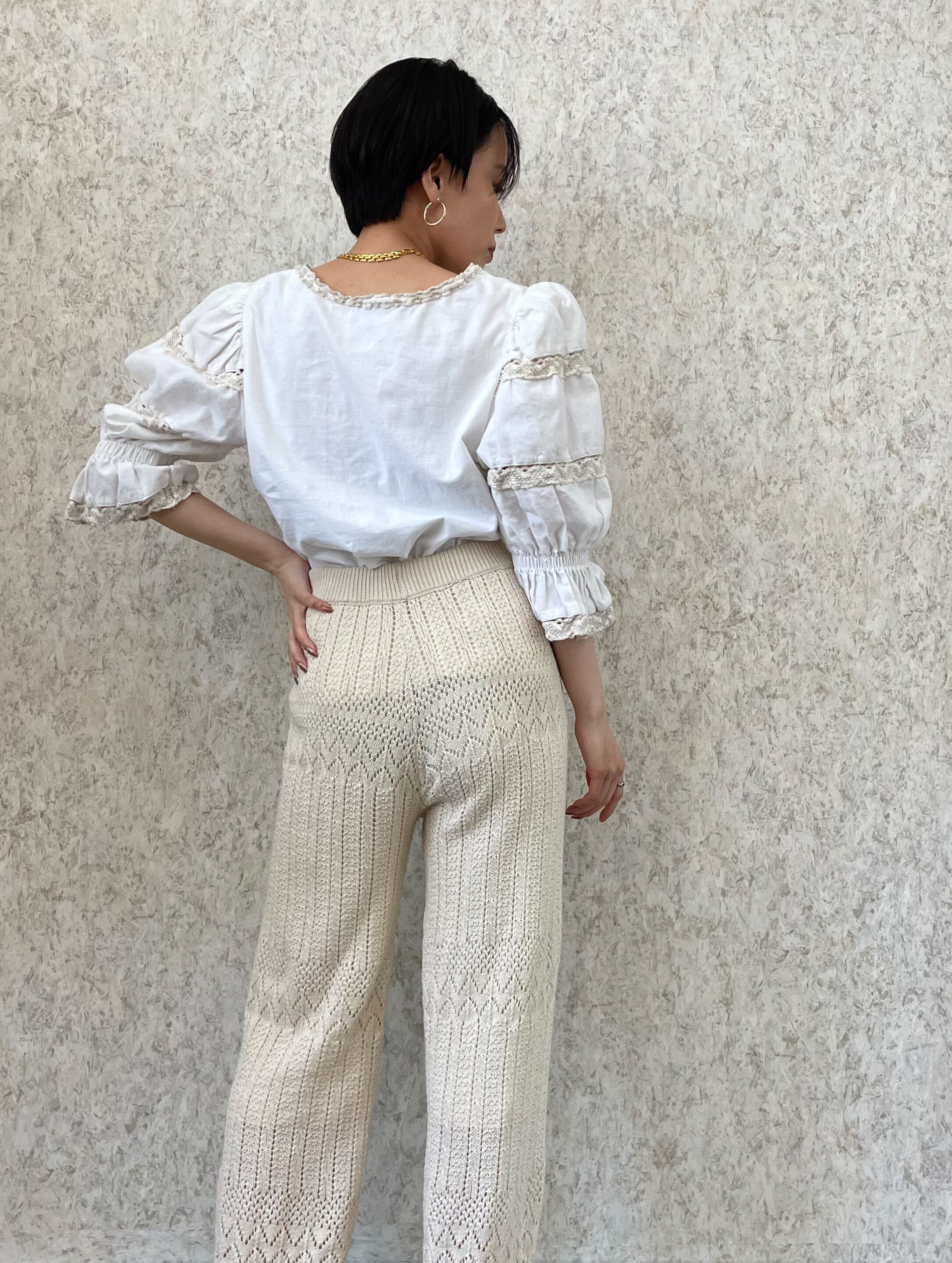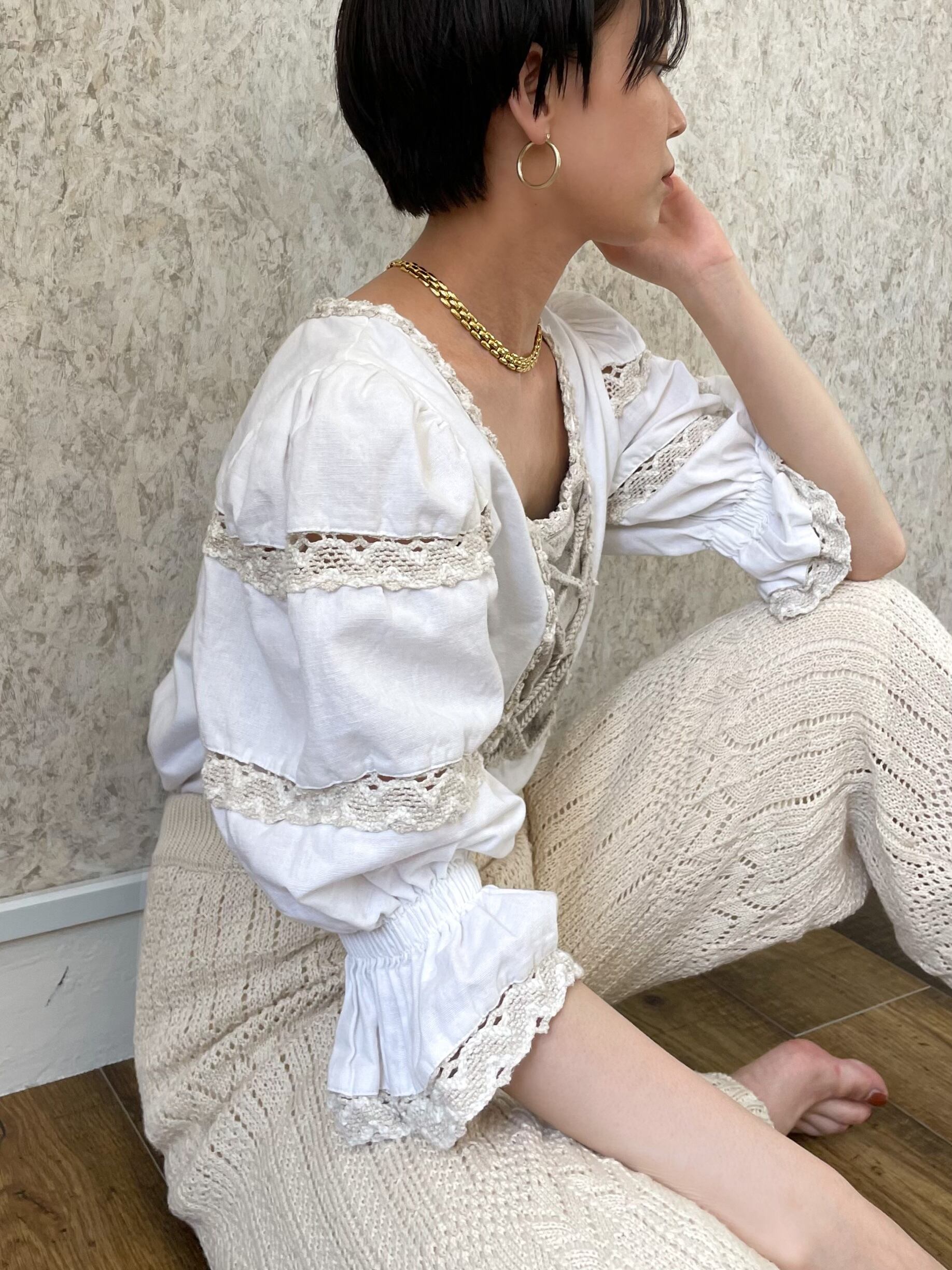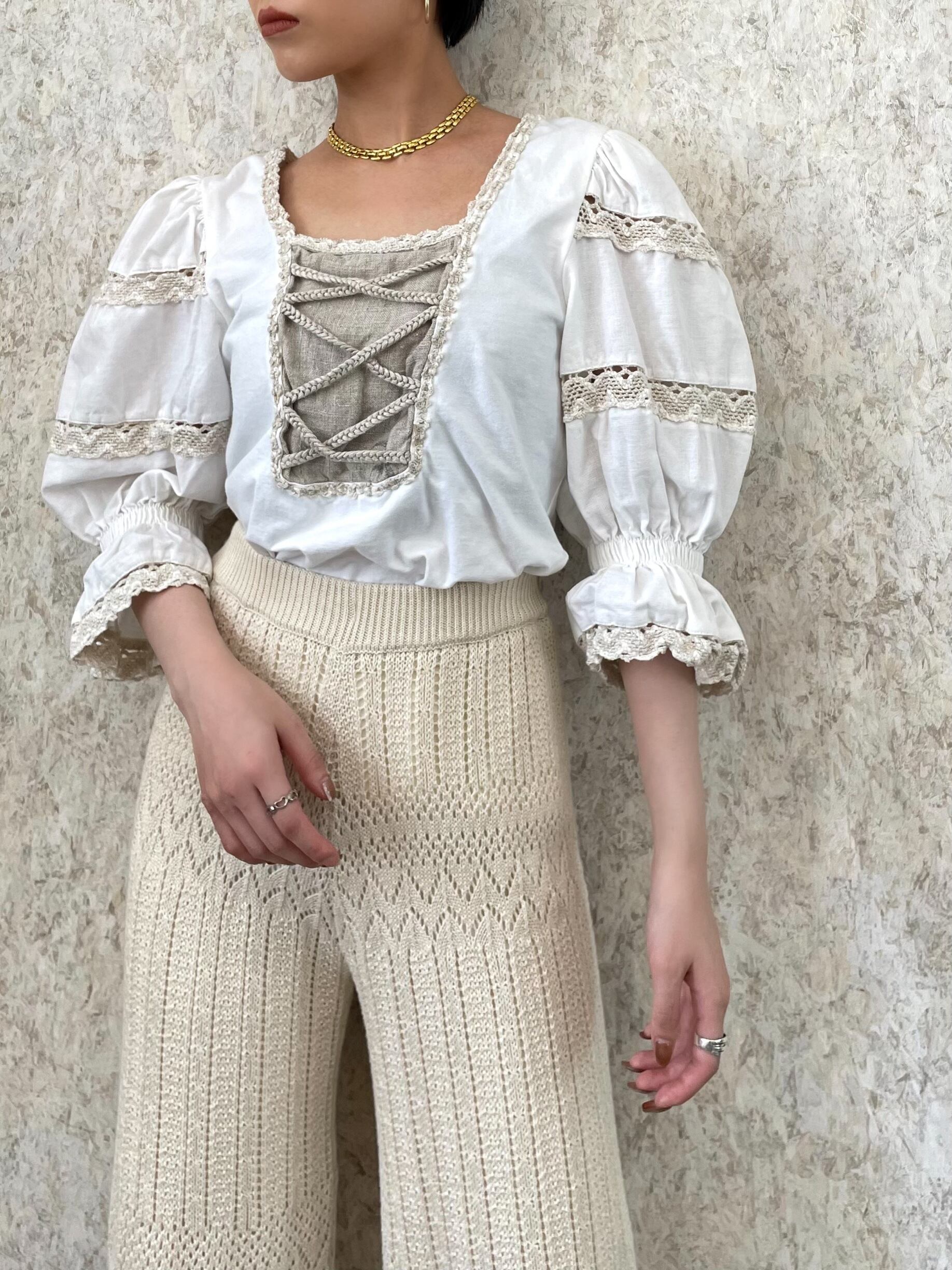 スクエアネックでデコルテを魅力的に。ボリュームのある袖とレースの隙間から見えるチラッとな肌見せが女の子らしくもチロリアンデザインで可愛らしすぎない1着。ボディー部分は伸縮性があり、ソフトな生地感なので着心地も抜群です。