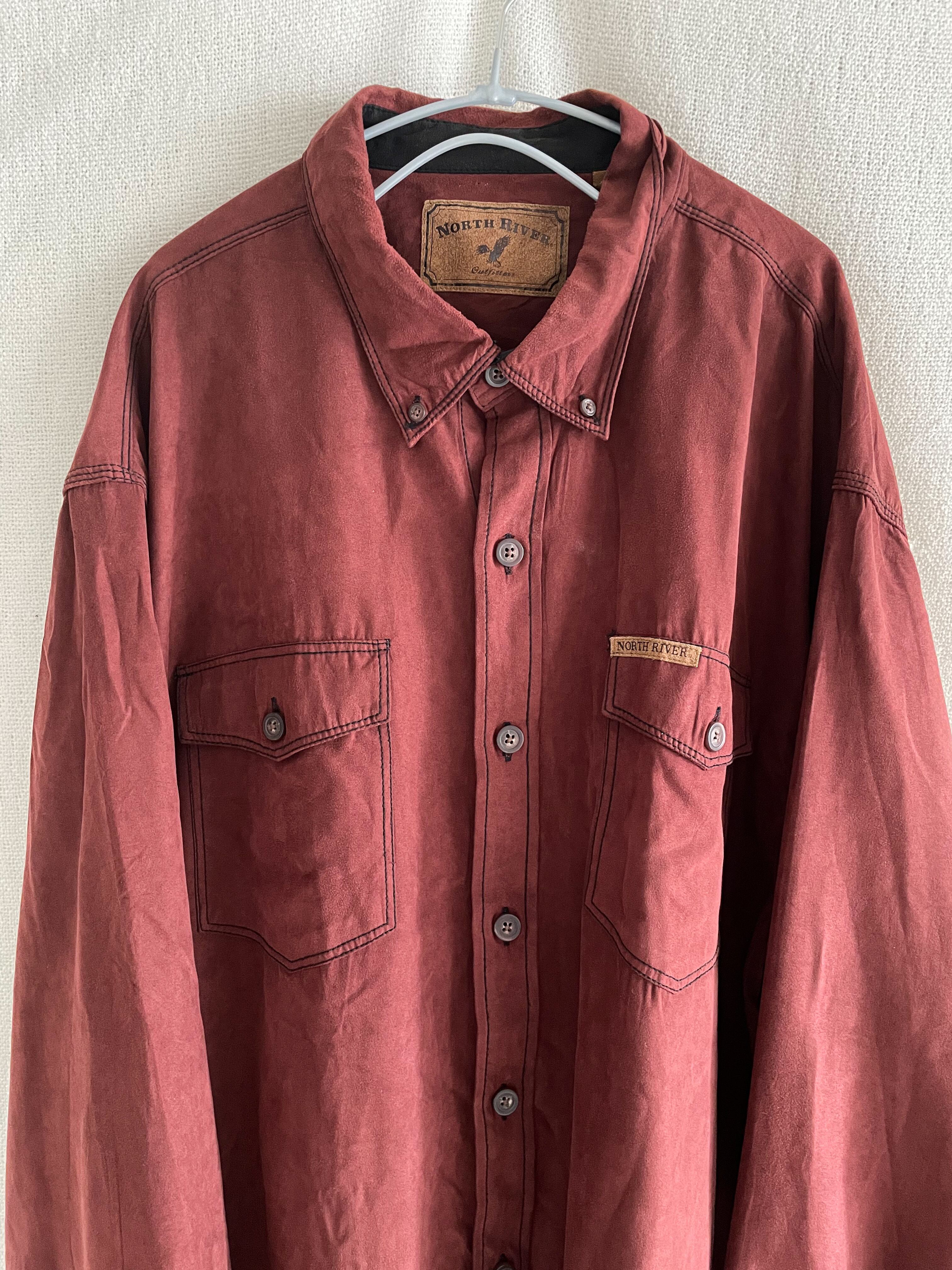 アメカジ好きにはたまらないnorth riverのビッグシャツ!メンズ物なのでユニセックスで着用して頂けフェイクスエード仕様。ポケット付属で機能性にも優れ、渋いボルドーカラーにブラックのダブルステッチに合わせて、タグのデザインにも可愛さが詰め込まれた一着です◎