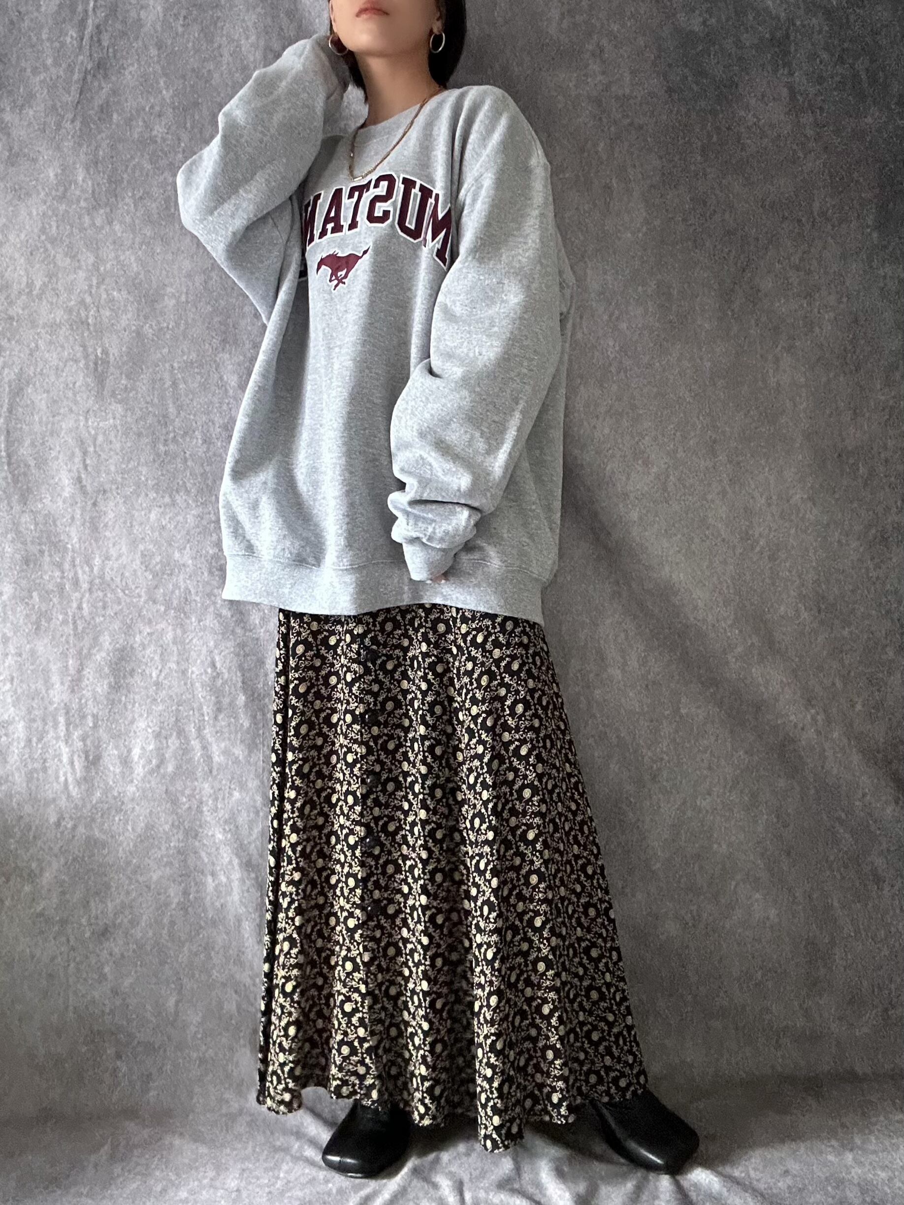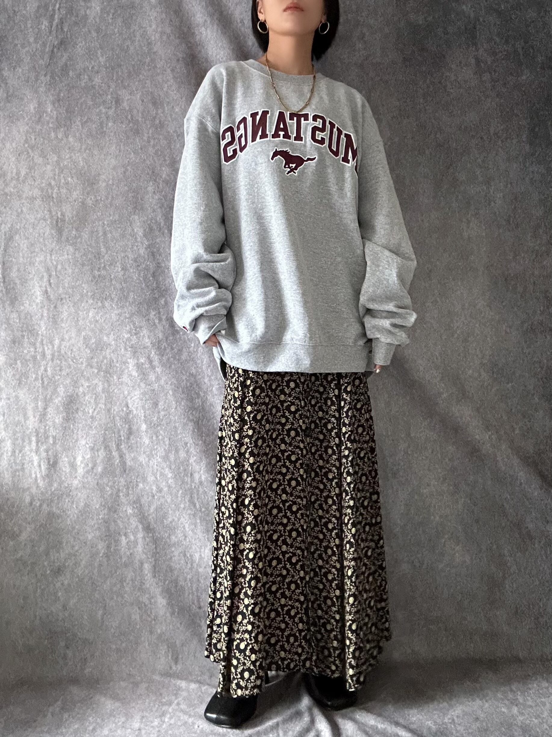 胸元に『mustangs』と大きな刺繍ワッペンがポイントとなったチャンピオンのカジュアルトレーナー。グレーにボルドーの配色が可愛く、オーバーサイズでゆったりと。どんなコーデにも合わせて頂きやすく、新品同様の綺麗さで、長年重宝してお使い頂けそうです◎