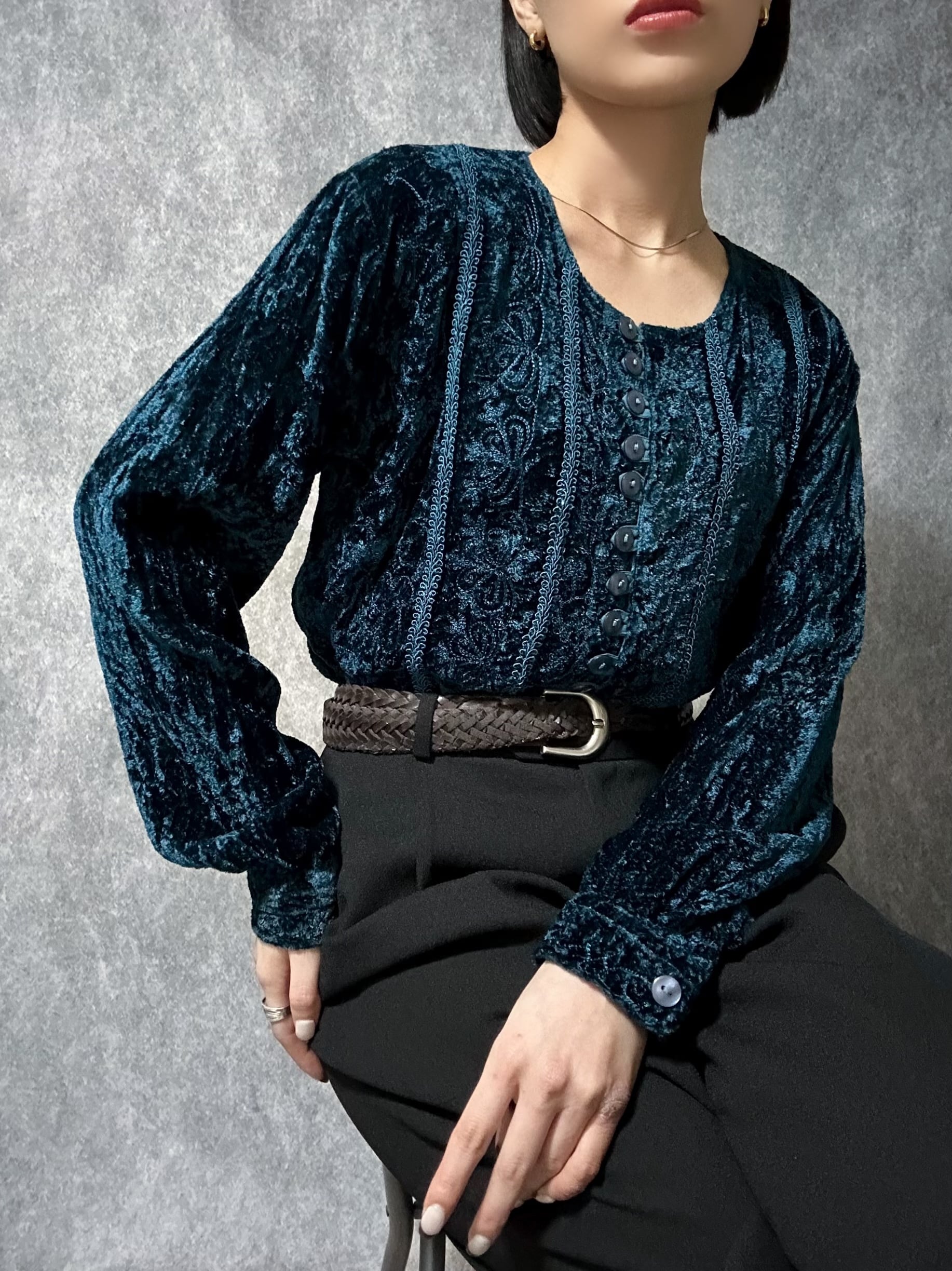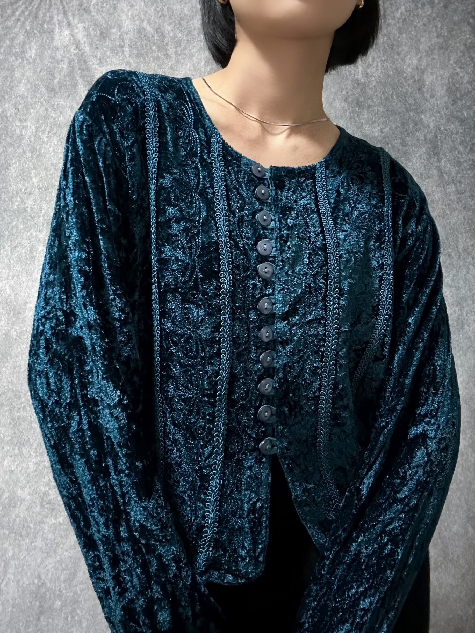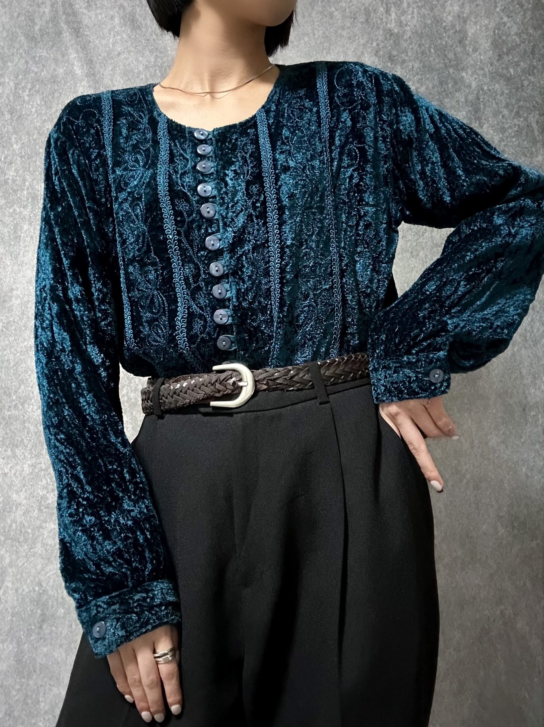 90s velour embroidery tops 90年代 ベロア 刺繍 トップス ブルー 古着トップス レディース古着 モード 個性 古着屋 ヴィンテージショップ
