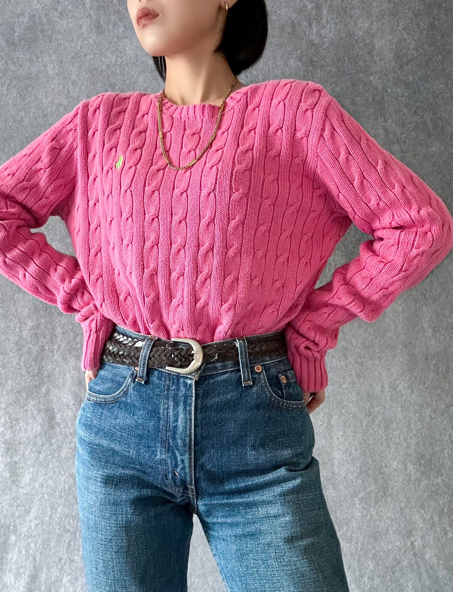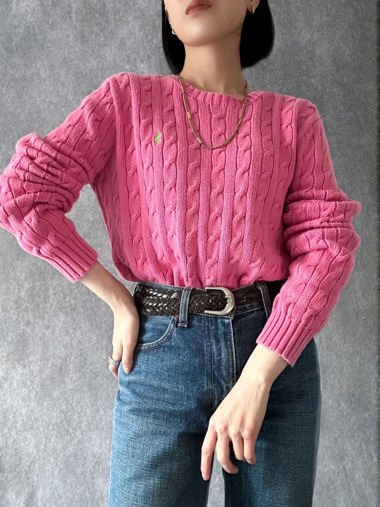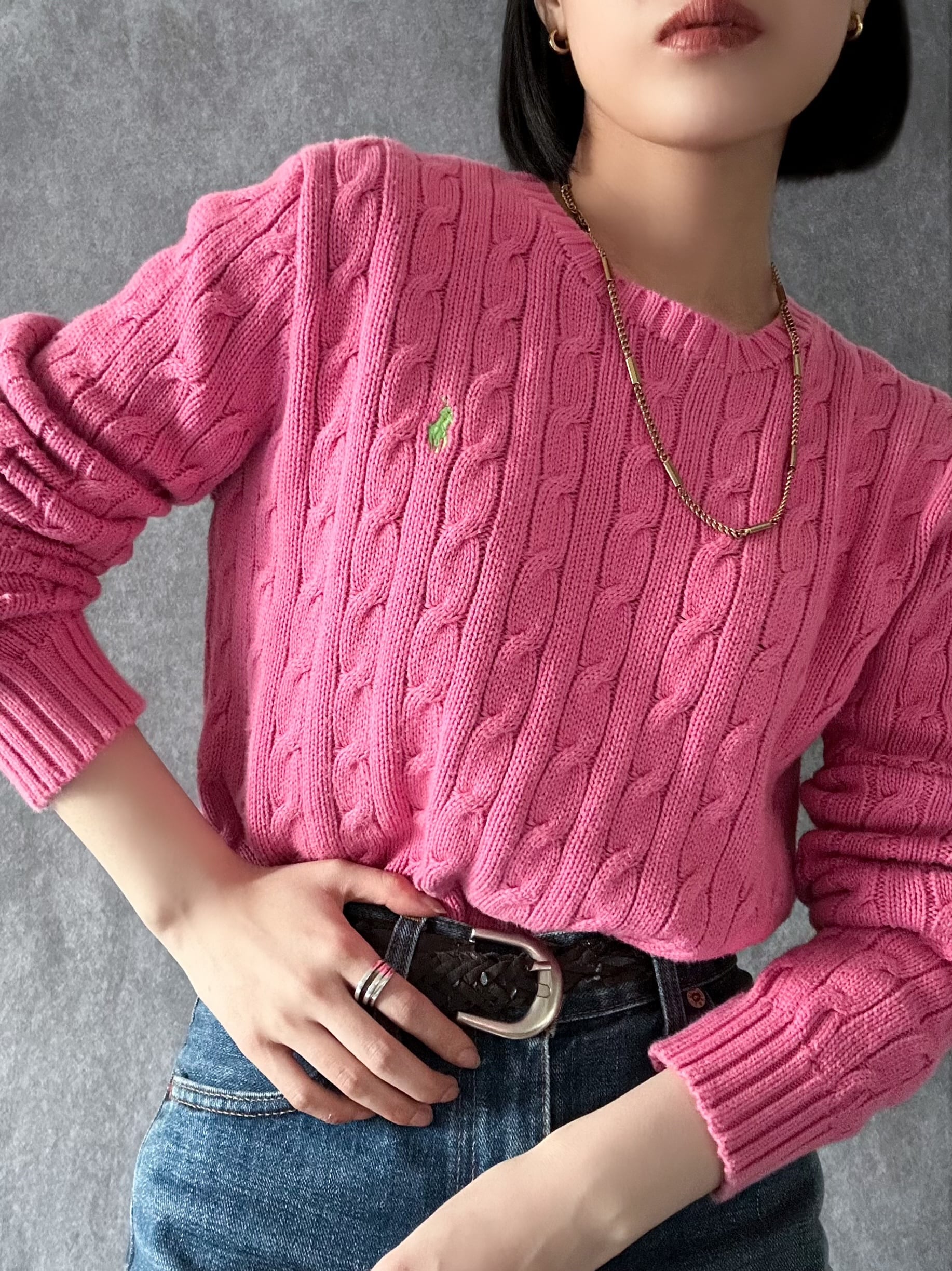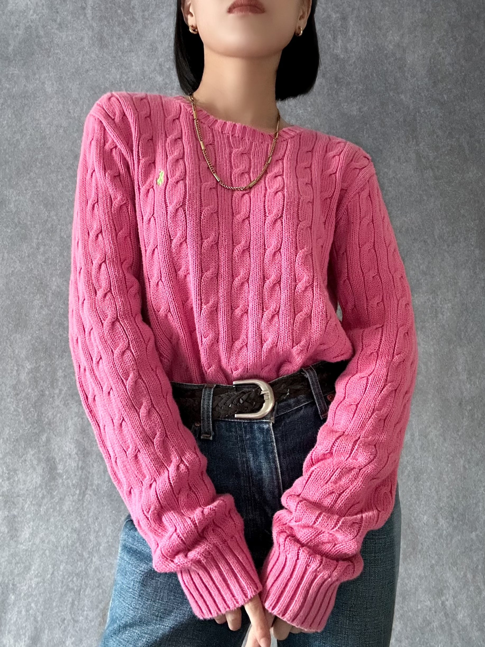 【ラルフローレン】ケーブルニット レディース ニット ラルフ ラルフローレン ピンク カラーニット クールネック カジュアル レディース古着 古着ニット 古着屋 ヴィンテージショップ