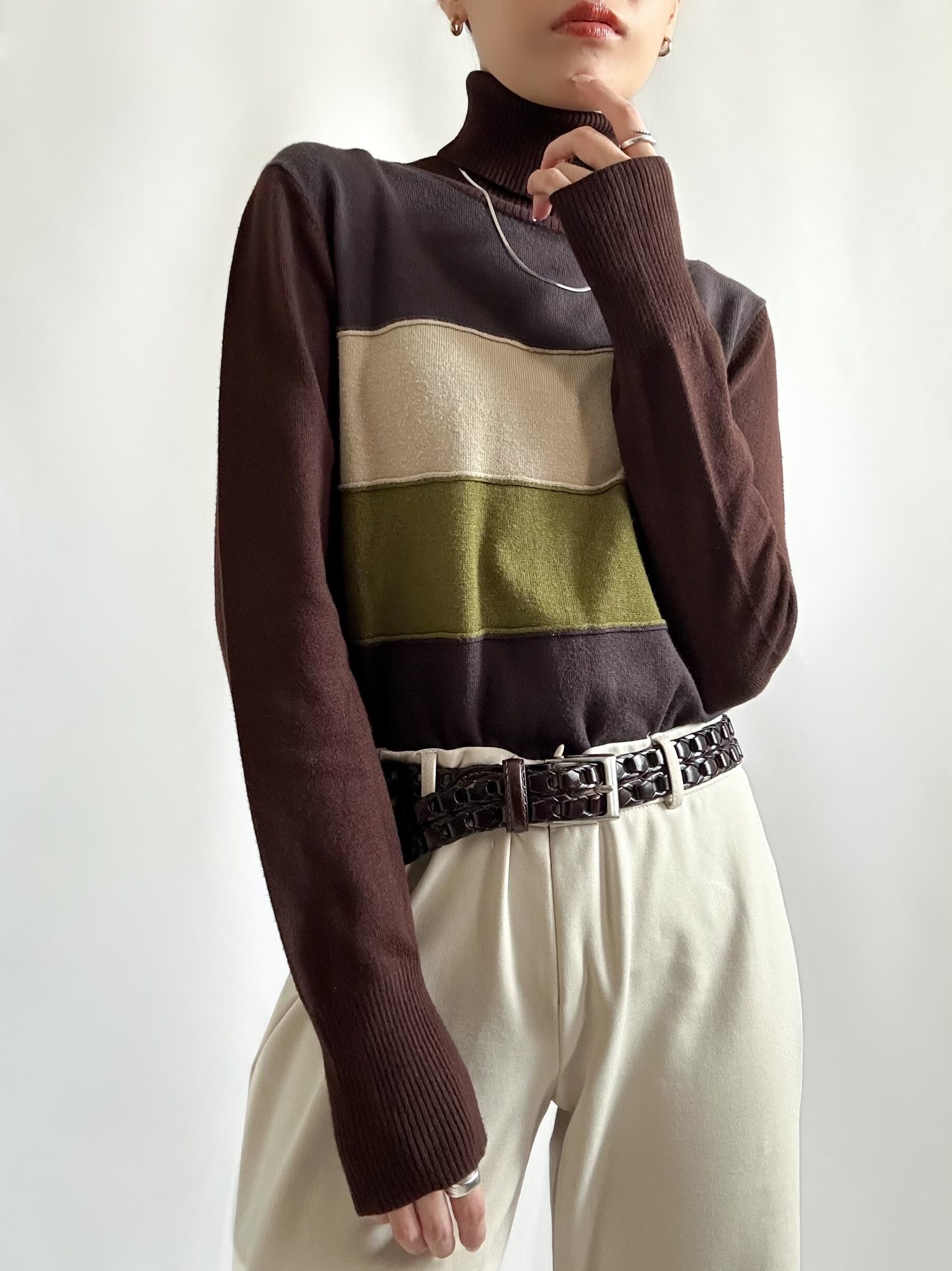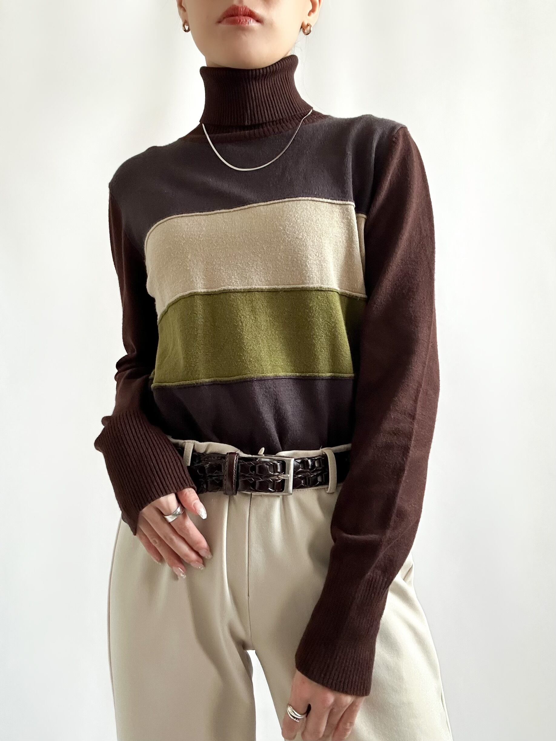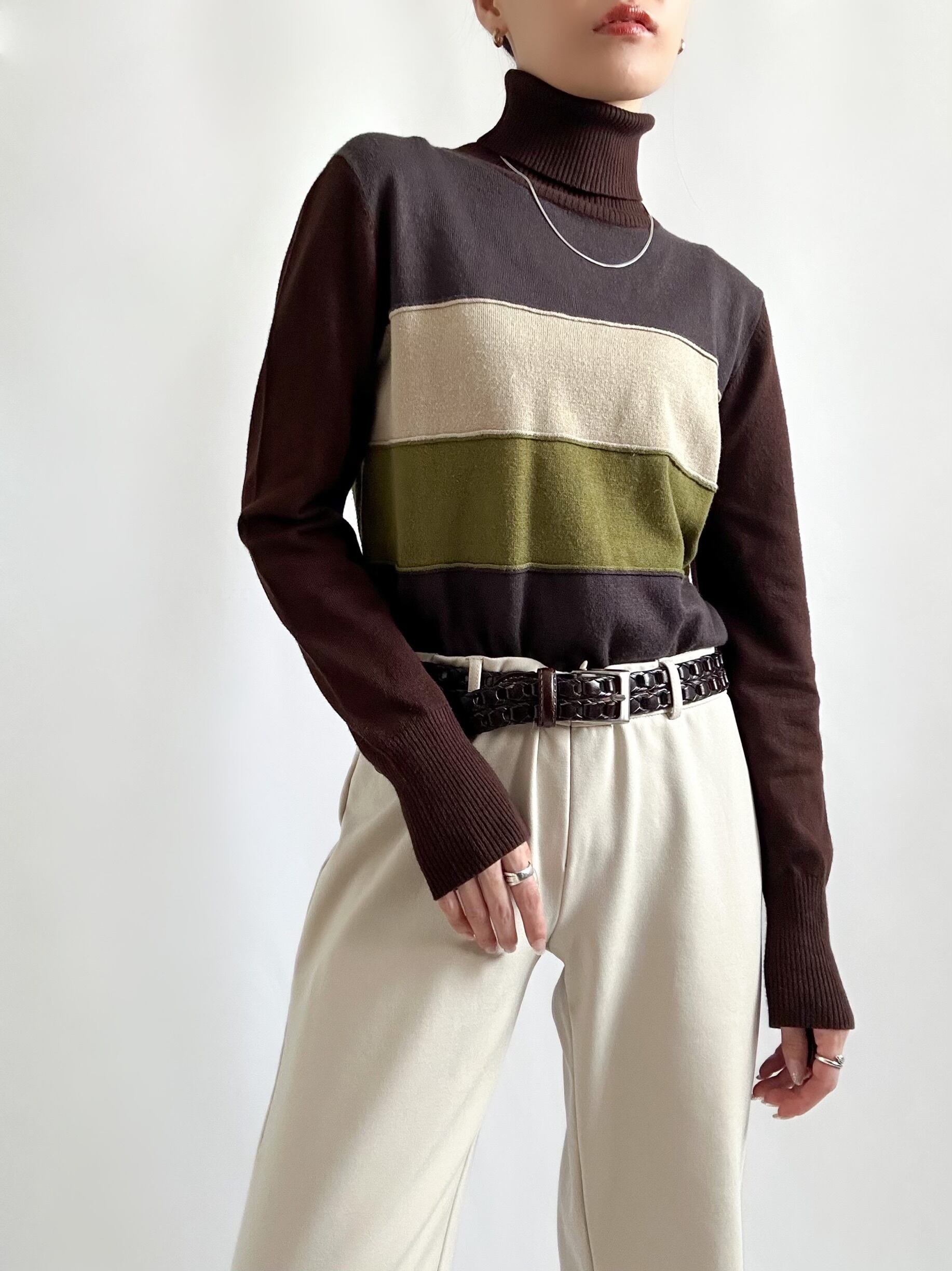 90s turtle border knit 90年代 タートルネックニット ボーダーニット ブラウン レディース古着 古着ニット 古着屋 ヴィンテージショップ