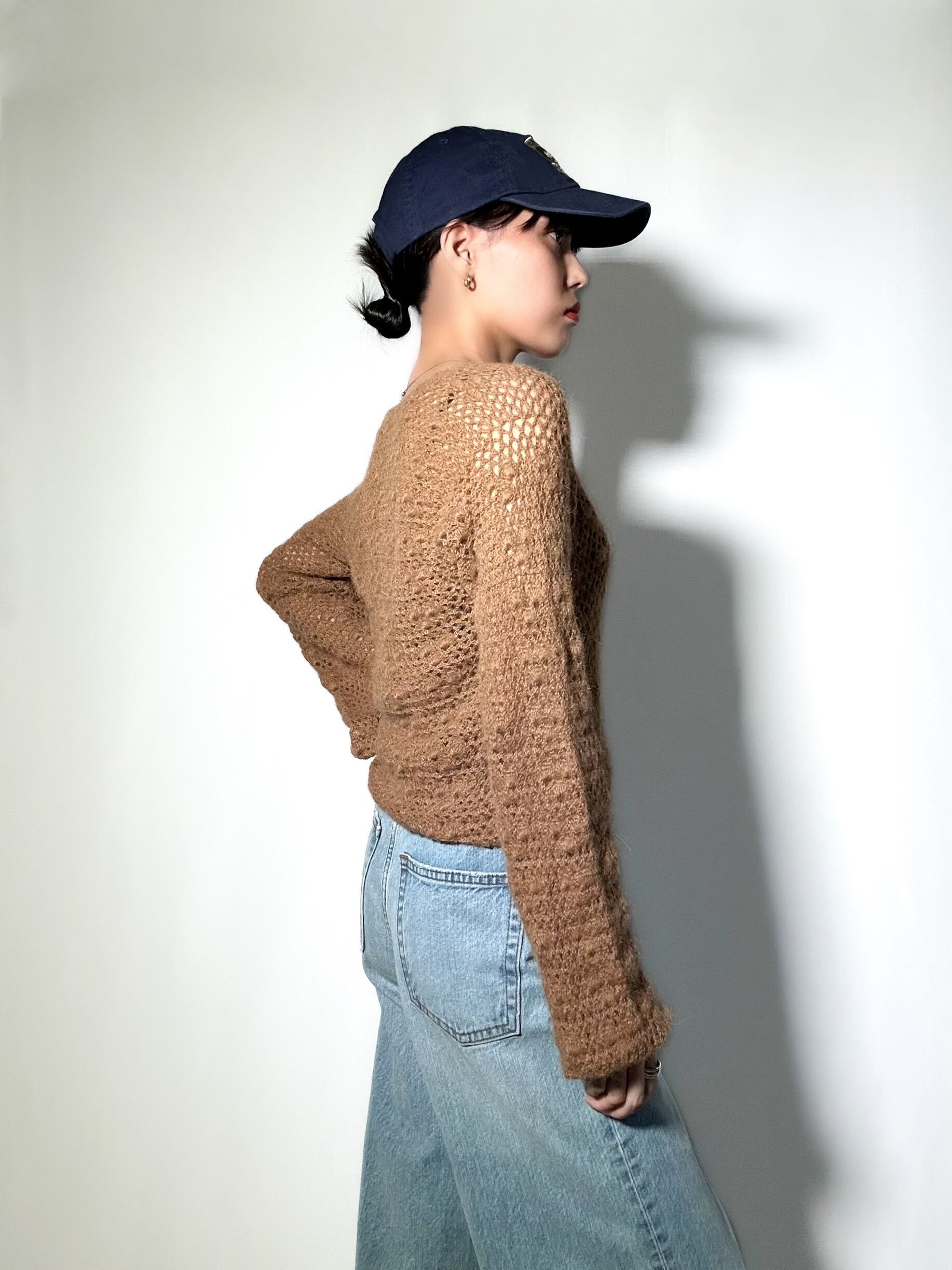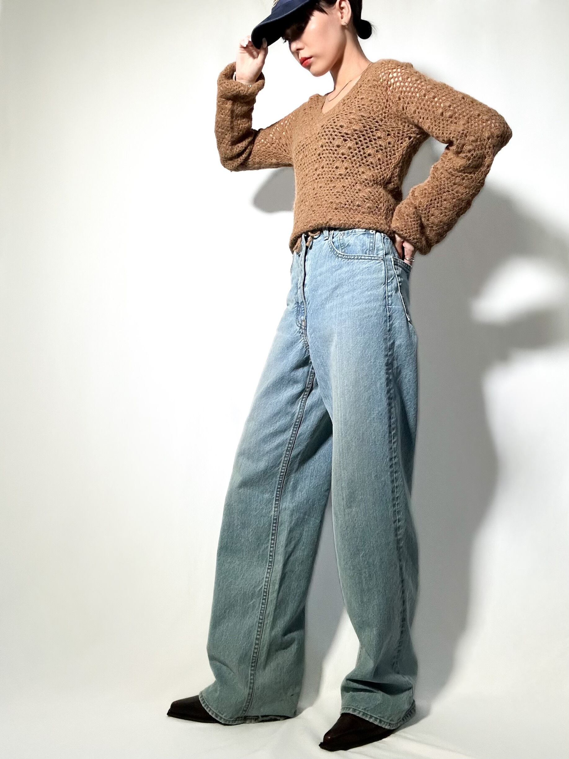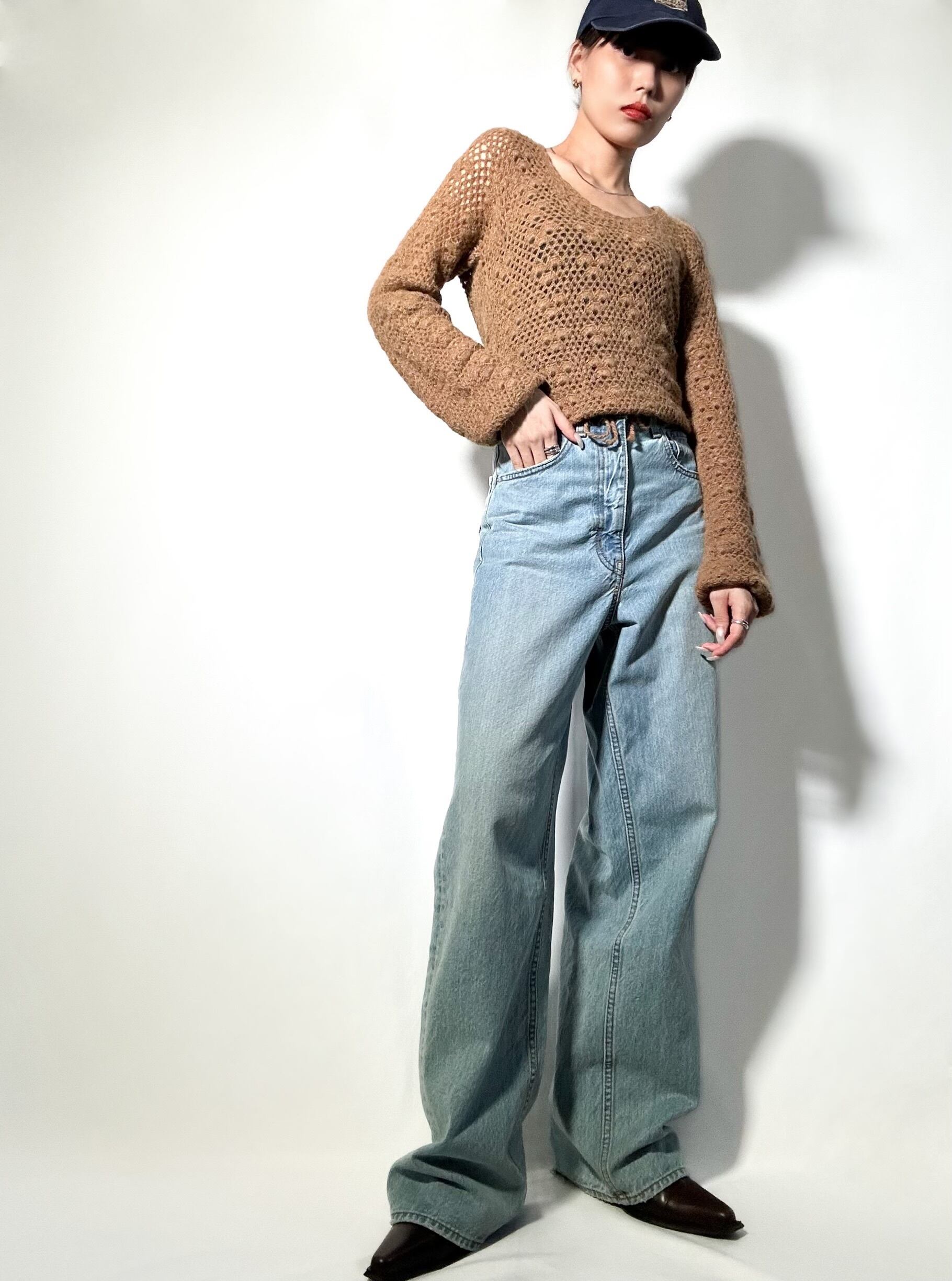 手編みで仕上げられた、一枚で存在感のあるハンドメイドニット。裾にはリボンが施されており、リボンを絞ればお好みの丈感でスタイルアップに◎程よい粗めな編み目で透け感があり、女性らしさを引き立ててくれます。カジュアルにお使い頂け、どんなコーデともマッチし、ハンドメイドという特別感を感じれる一着です◎