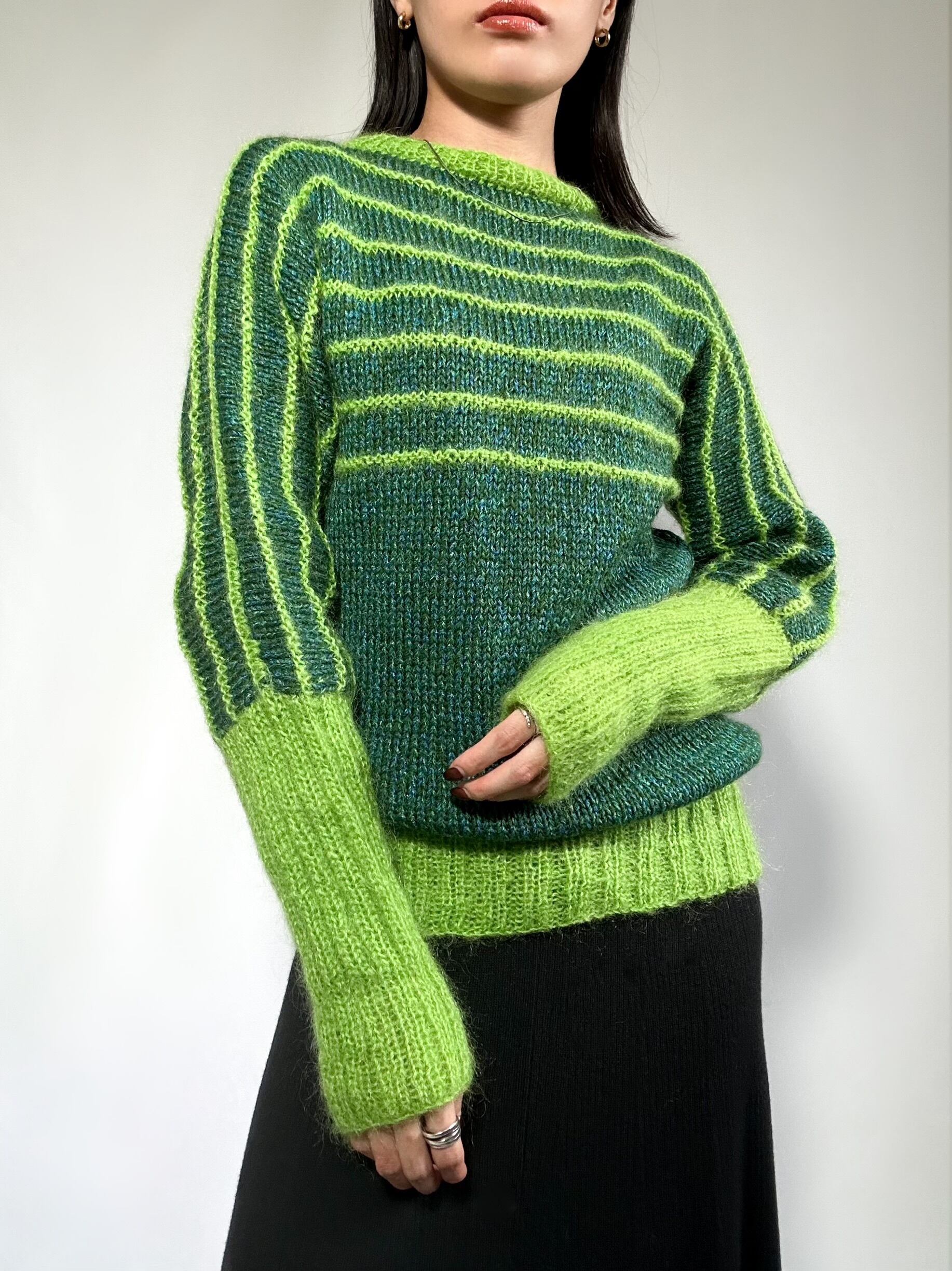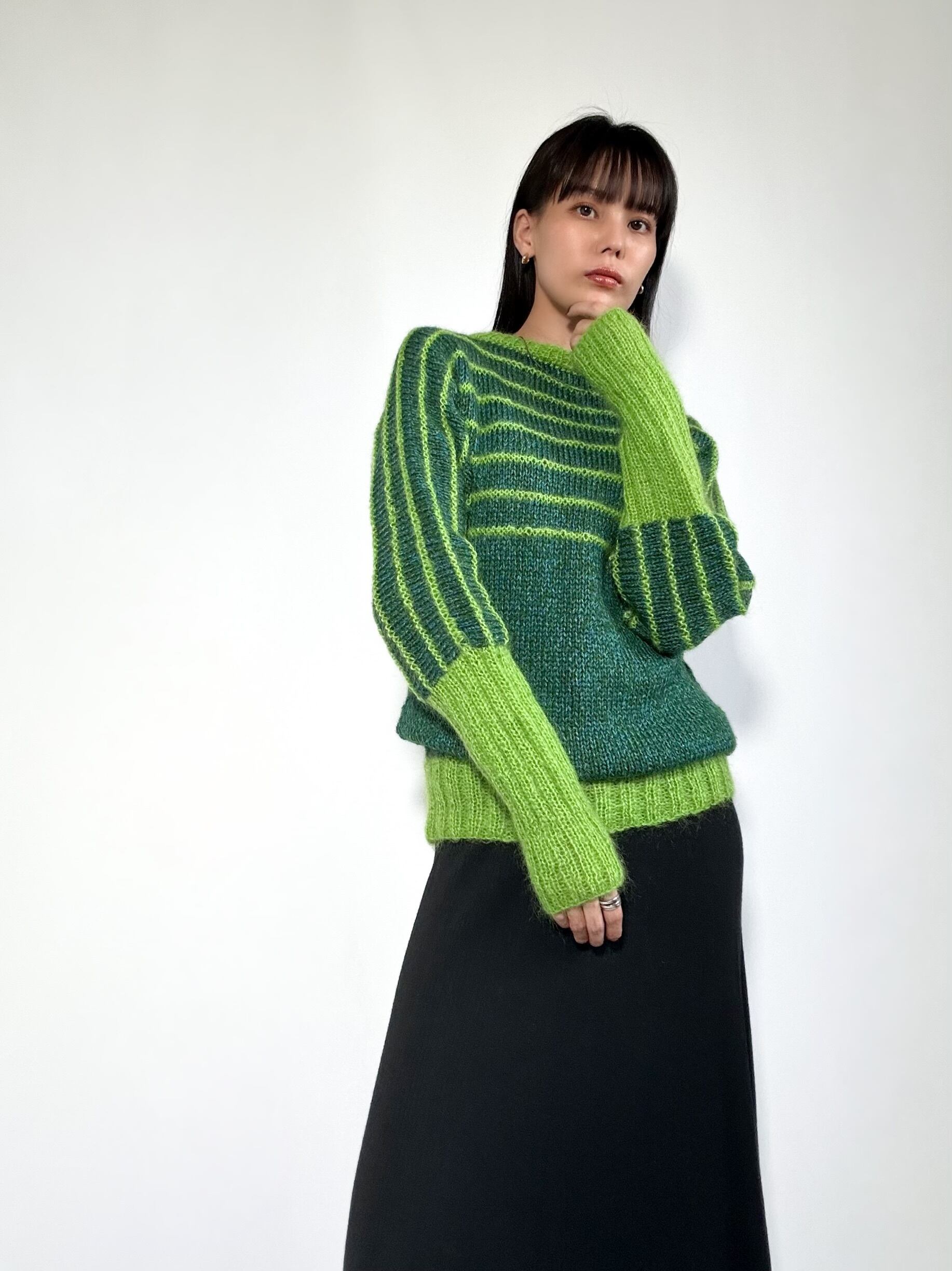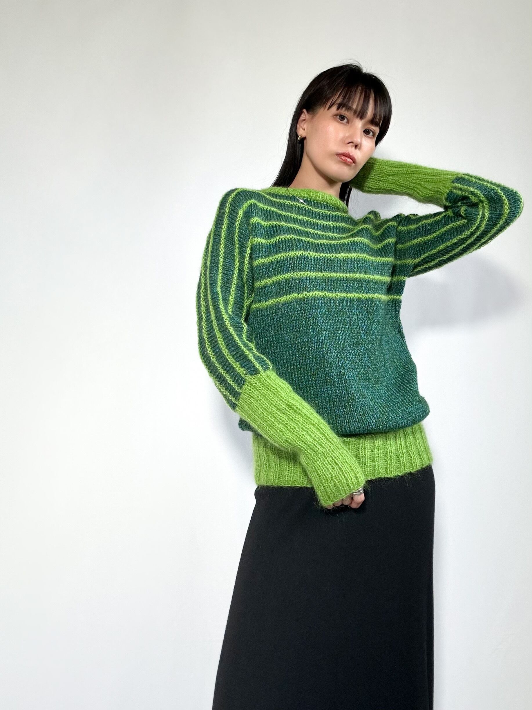 色鮮やかなグリーンカラーが綺麗な、ちょっぴりと個性漂うUSEDニット。袖の切り替えデザインが素敵で、よく見るとベースのグリーンカラーの糸にラメ感のあるグリーンとブルーの糸が一緒に編み込まれており、さりげないキラキラ感がとっても可愛く、存在感のある一着です◎