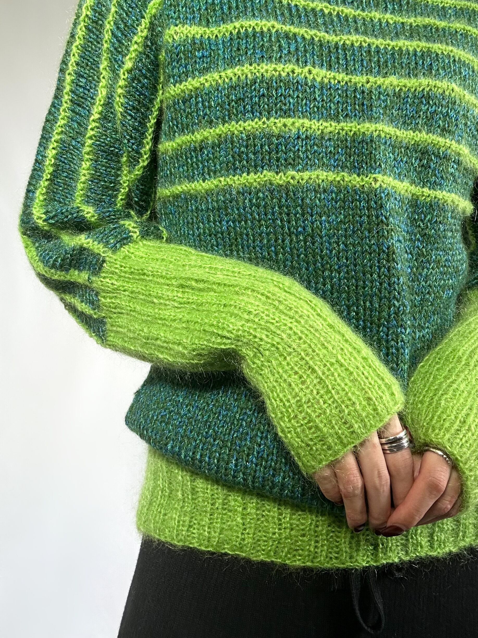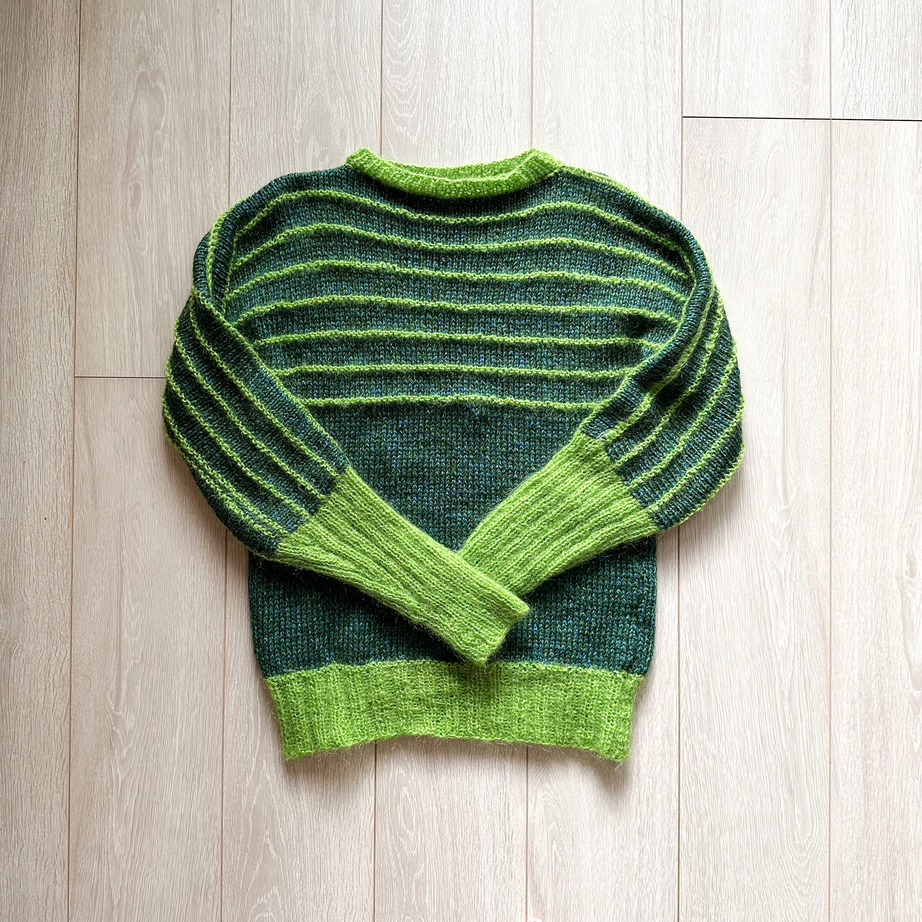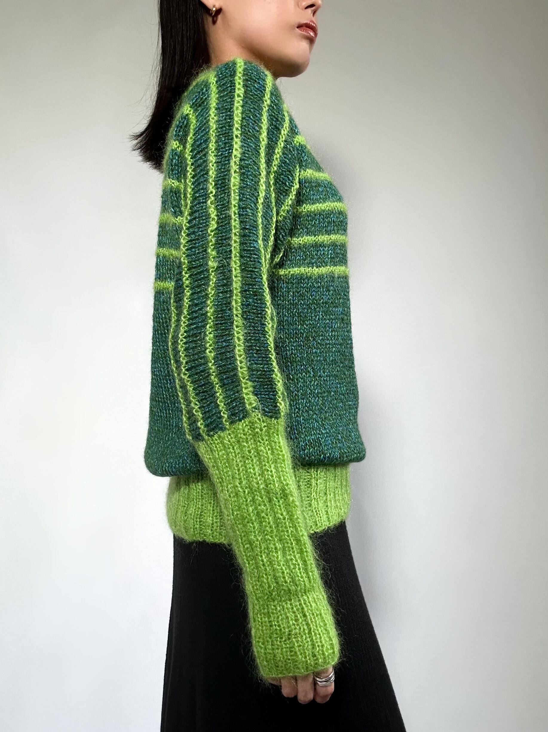 色鮮やかなグリーンカラーが綺麗な、ちょっぴりと個性漂うUSEDニット。袖の切り替えデザインが素敵で、よく見るとベースのグリーンカラーの糸にラメ感のあるグリーンとブルーの糸が一緒に編み込まれており、さりげないキラキラ感がとっても可愛く、存在感のある一着です◎