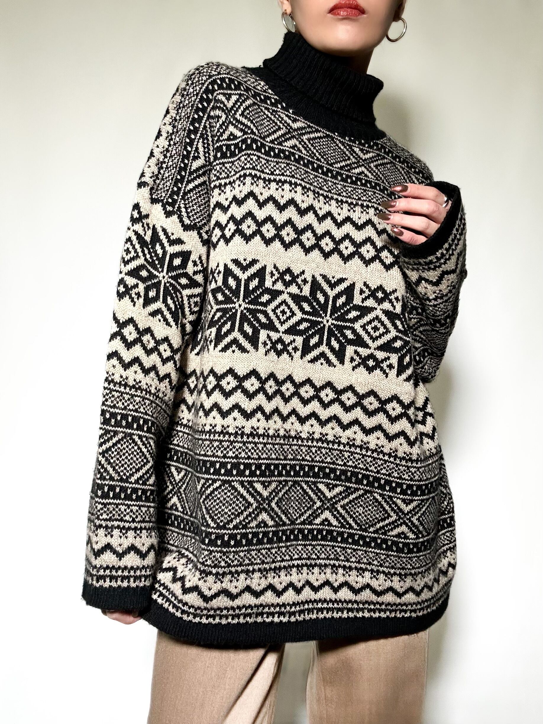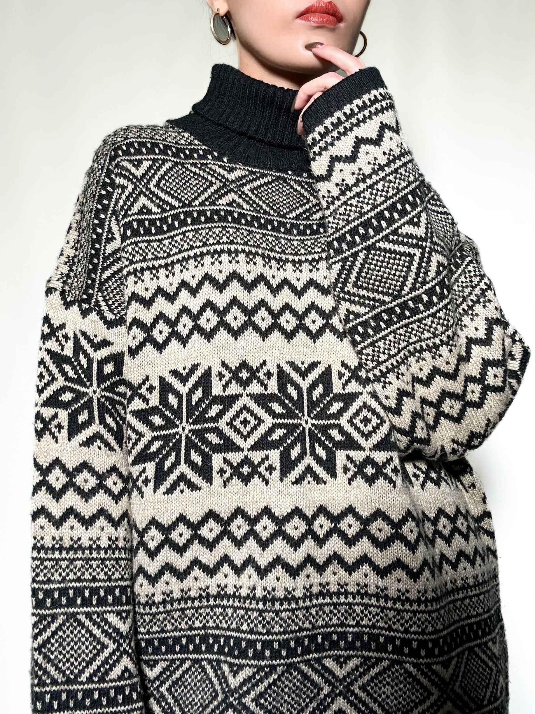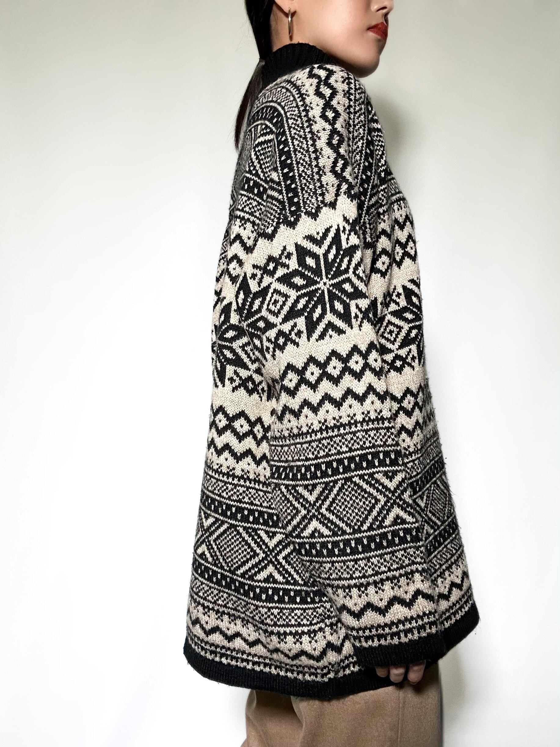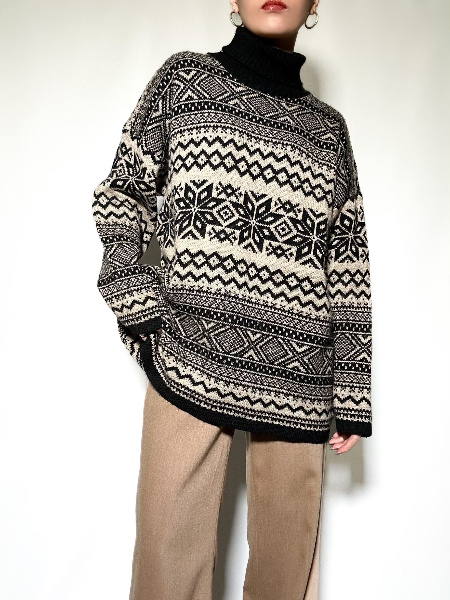 90s nordic turtle neck sweater 90年代 ノルディック柄 ノルディック柄セーター 古着セーター 古着ニット 総柄ニット モノトーン レディース古着 古着屋 ヴィンテージショップ