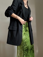 オールブラックで統一されたシックな印象のシングルジャケット。ストライプのライン効果でシルエットも綺麗に、スタイリッシュな印象に◎特別な日のフォーマルなスタイリングにもお使い頂けます。
