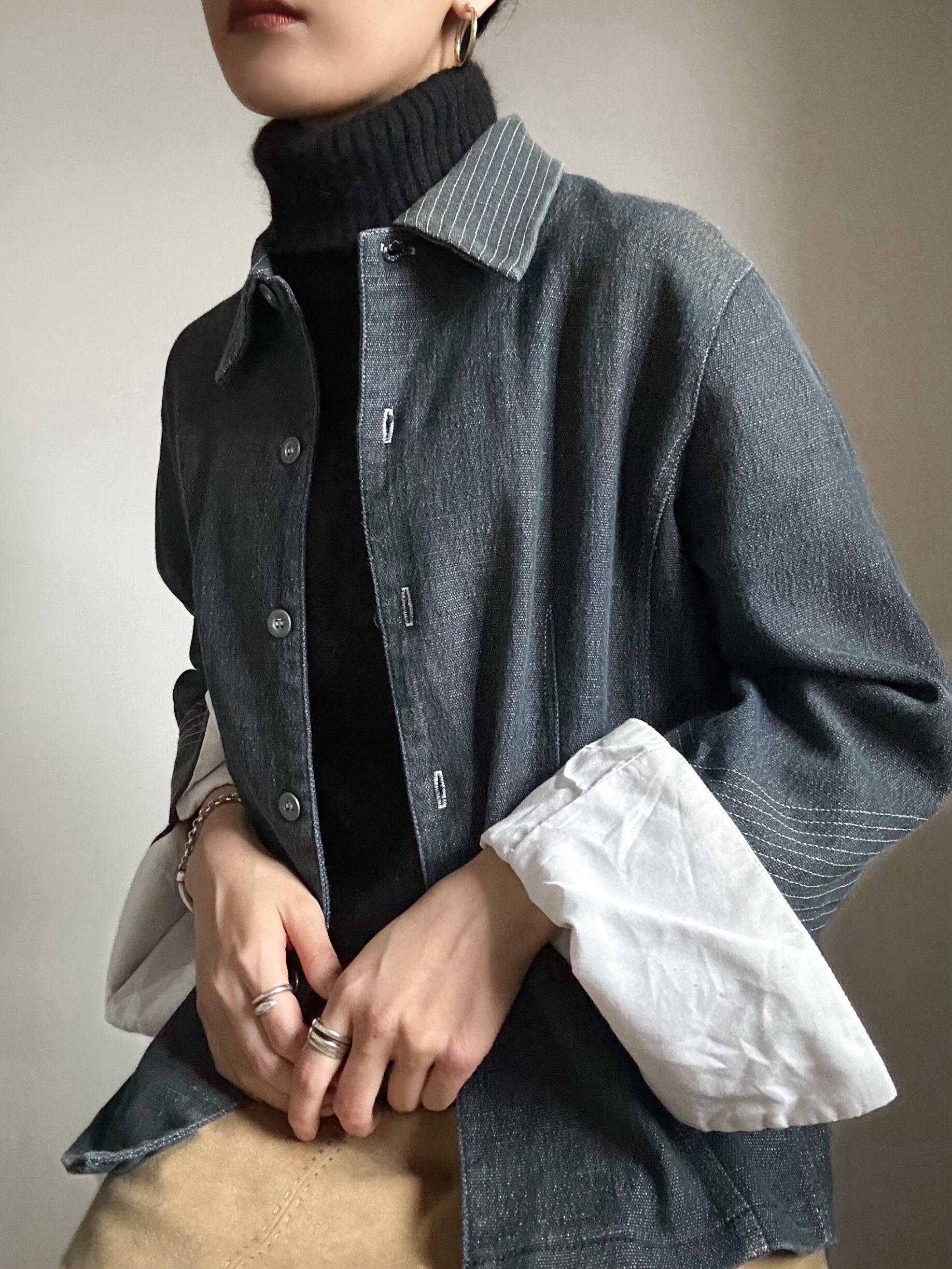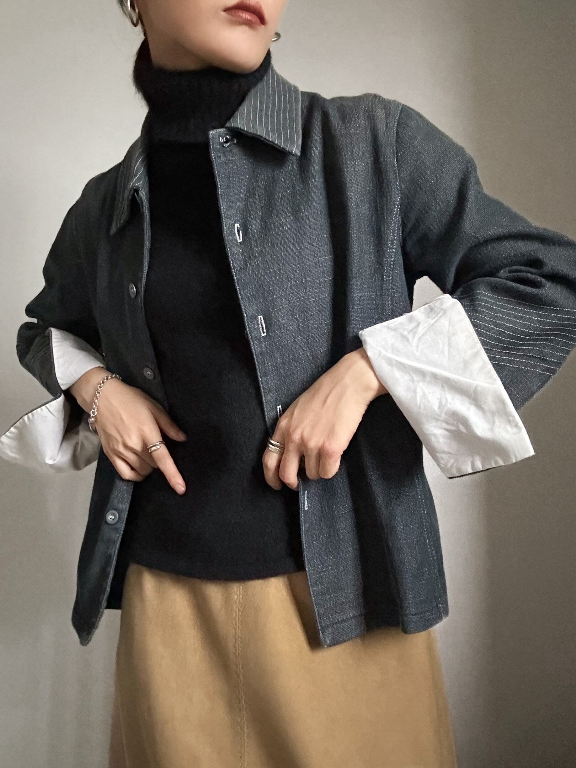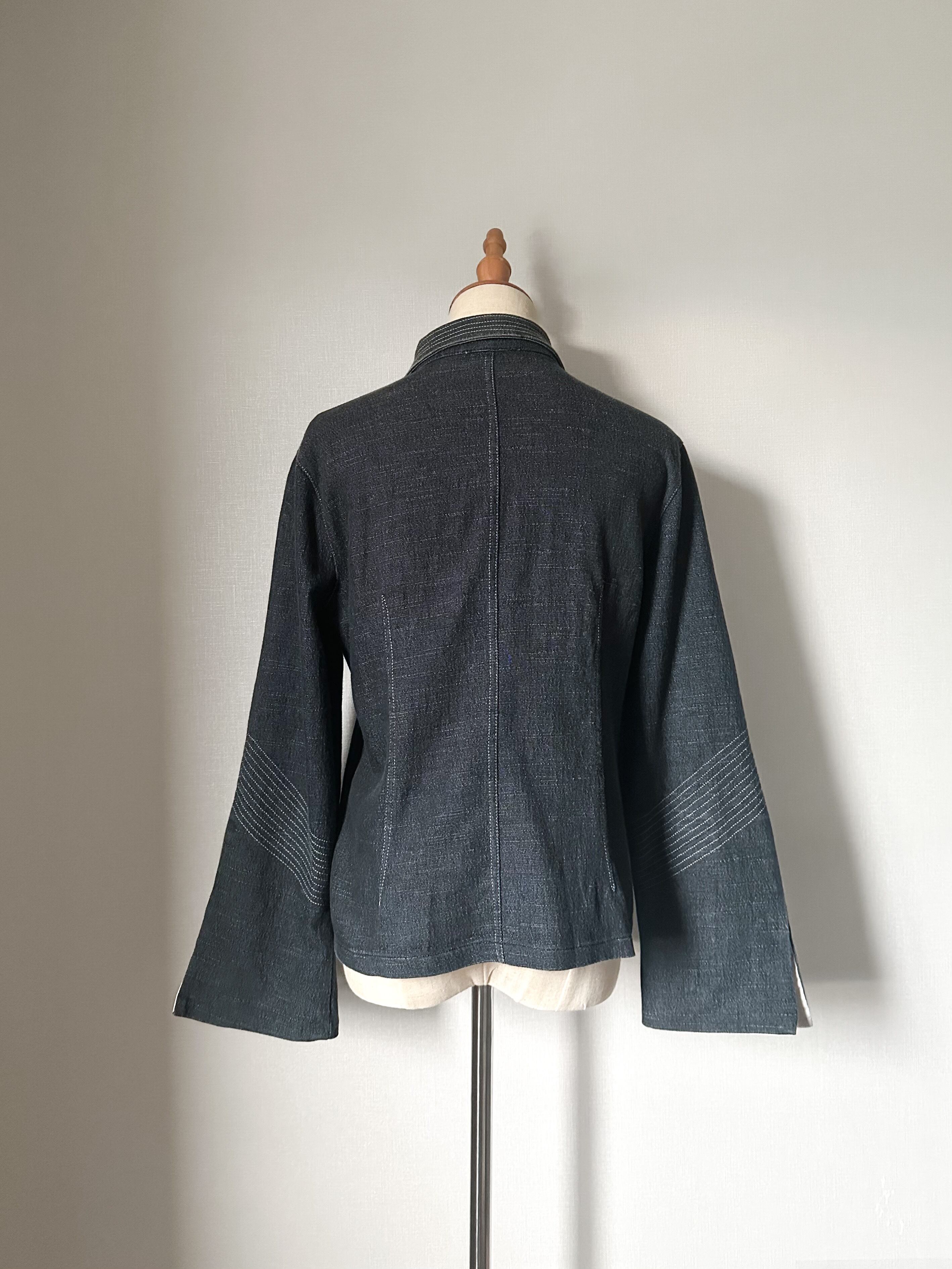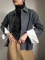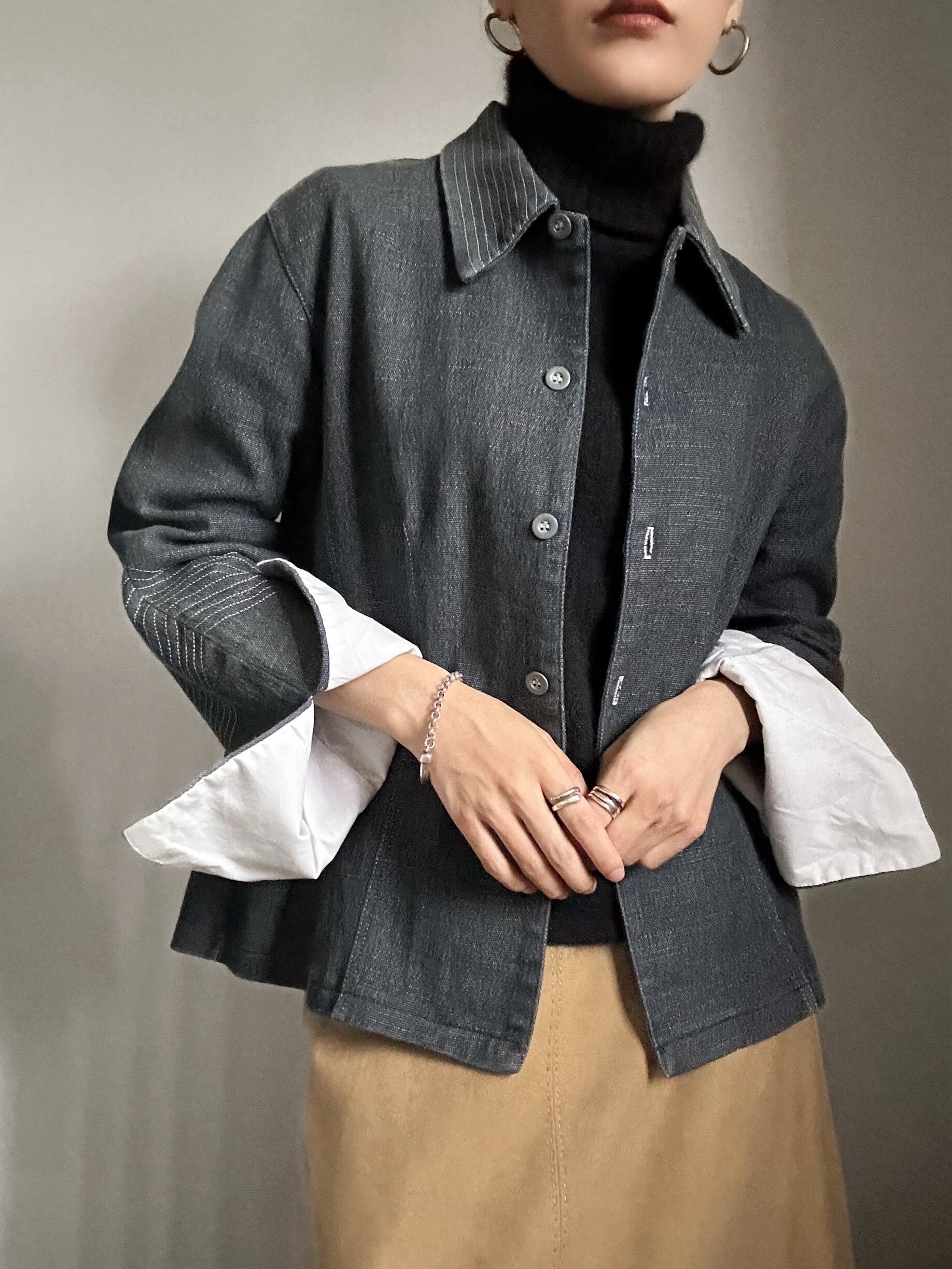 両袖に深めのスリットが入っており、着丈はジャストサイズなのに対し、袖丈は少し長め仕様に。スリット効果と相まって手を長く綺麗に魅せてくれます。カラーもブラックデニムを何回もウォッシュして青みが出てきた様な絶妙なカラーで、歳を重ねてもお使い頂ける落ち着きのある大人かわいいデニムジャケットとなっております!