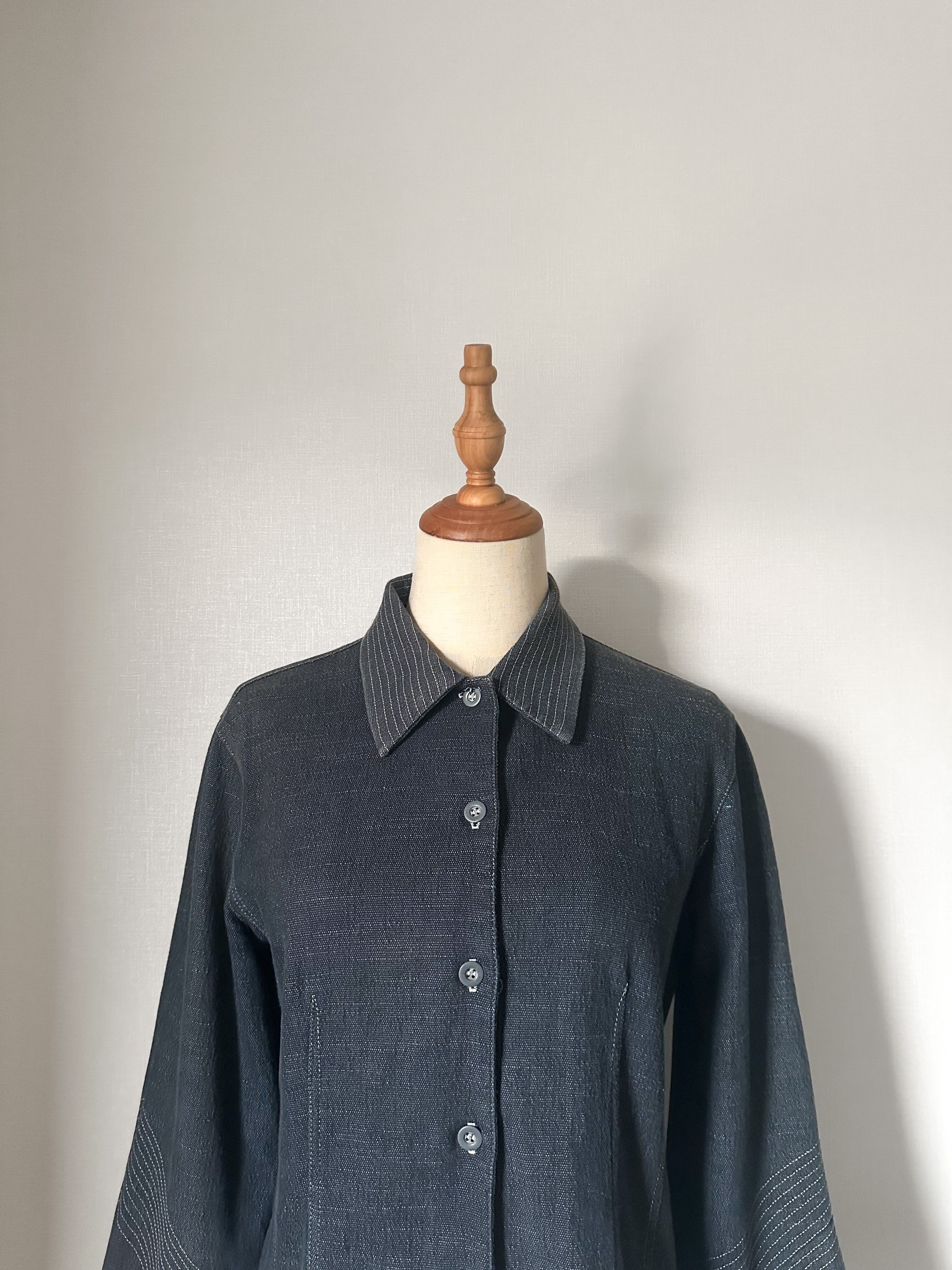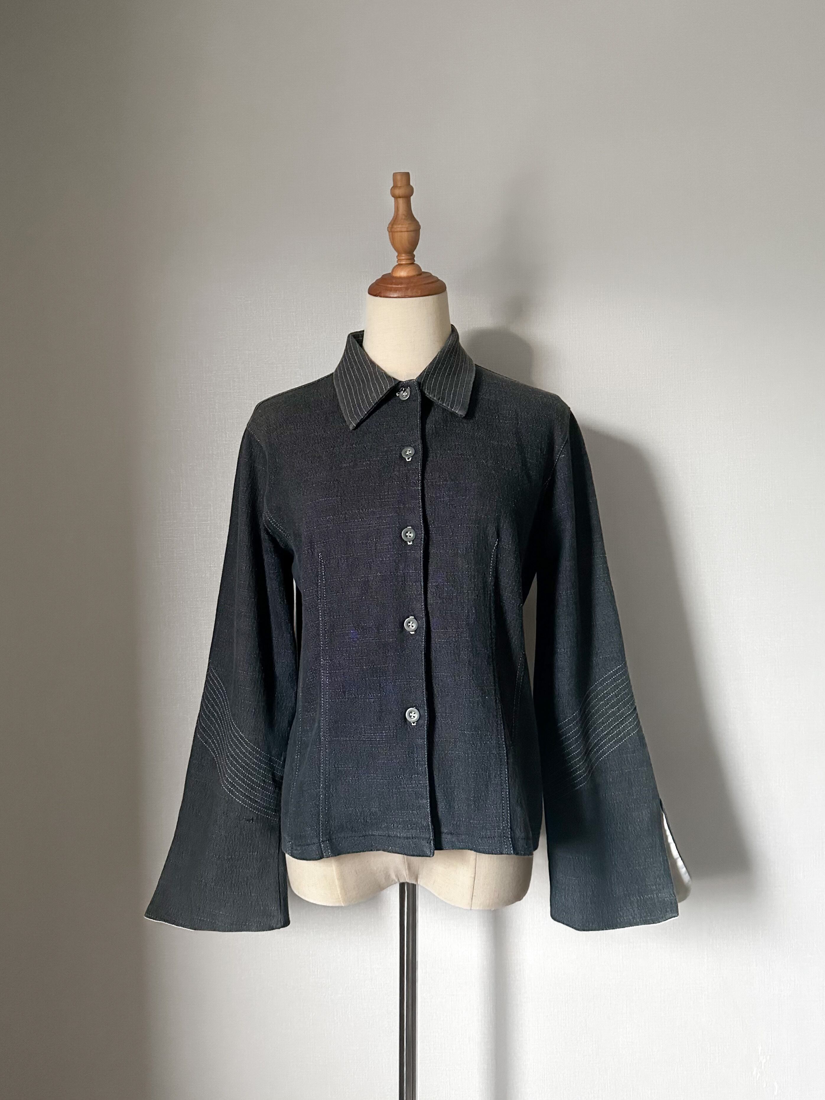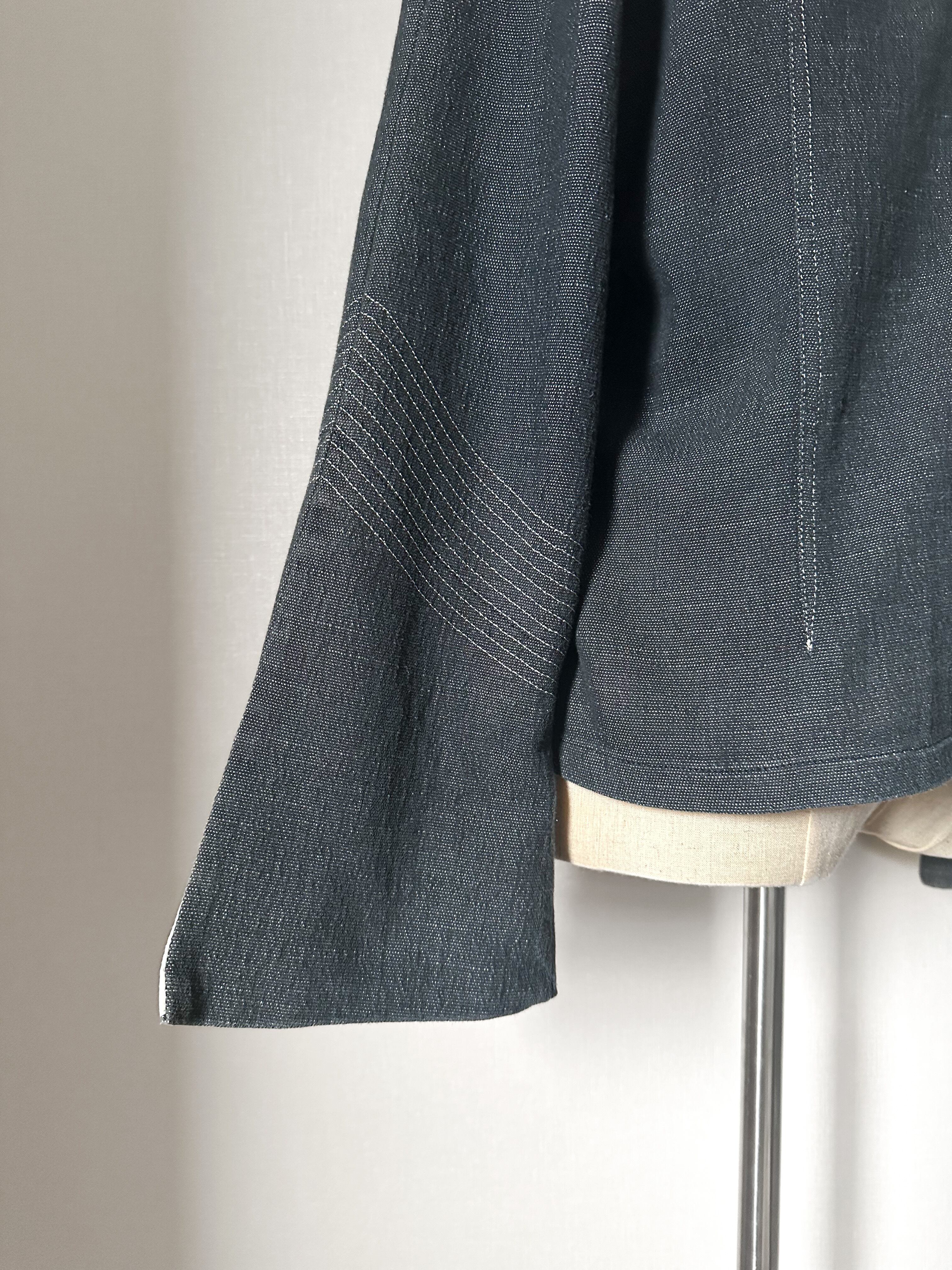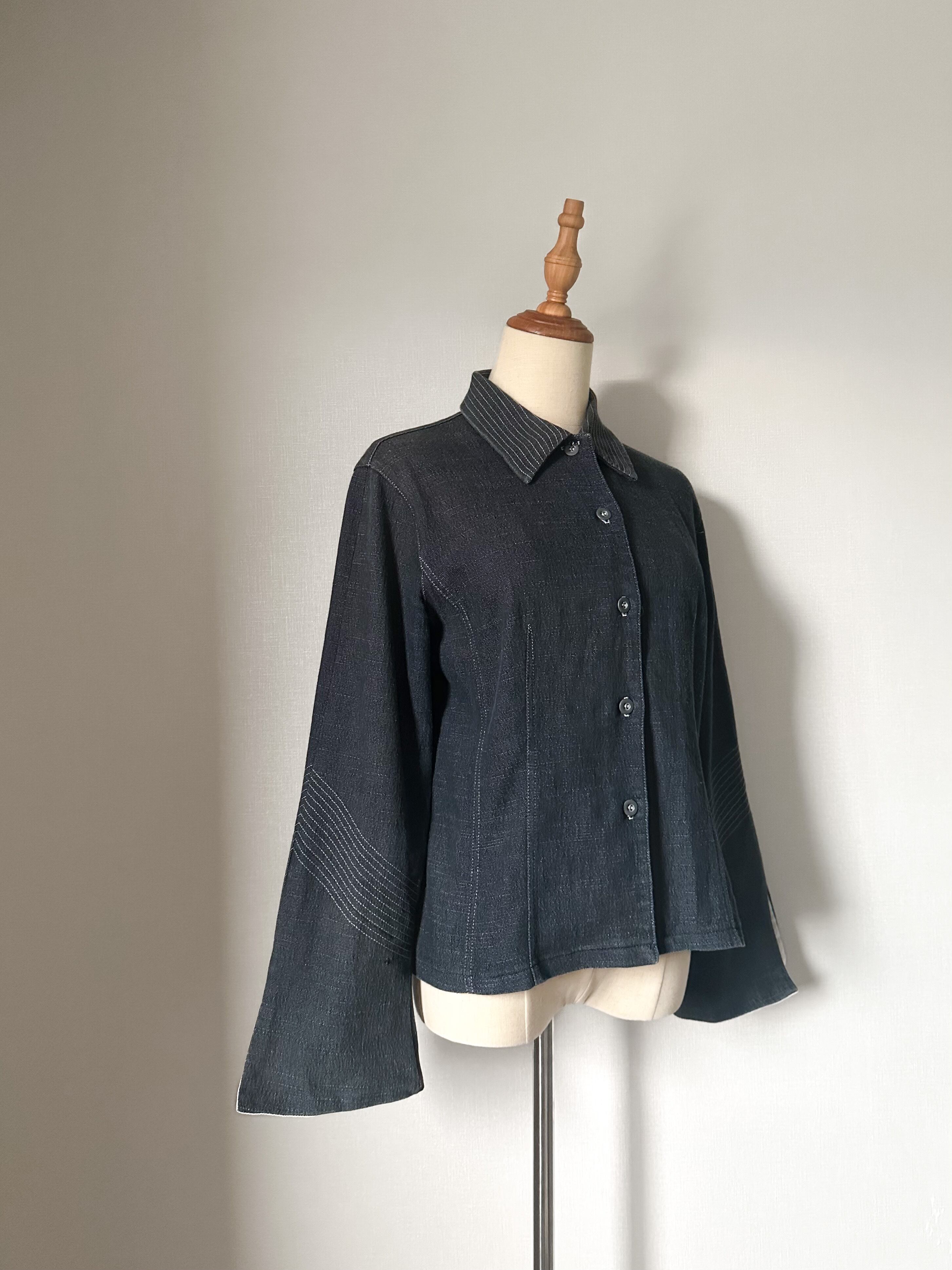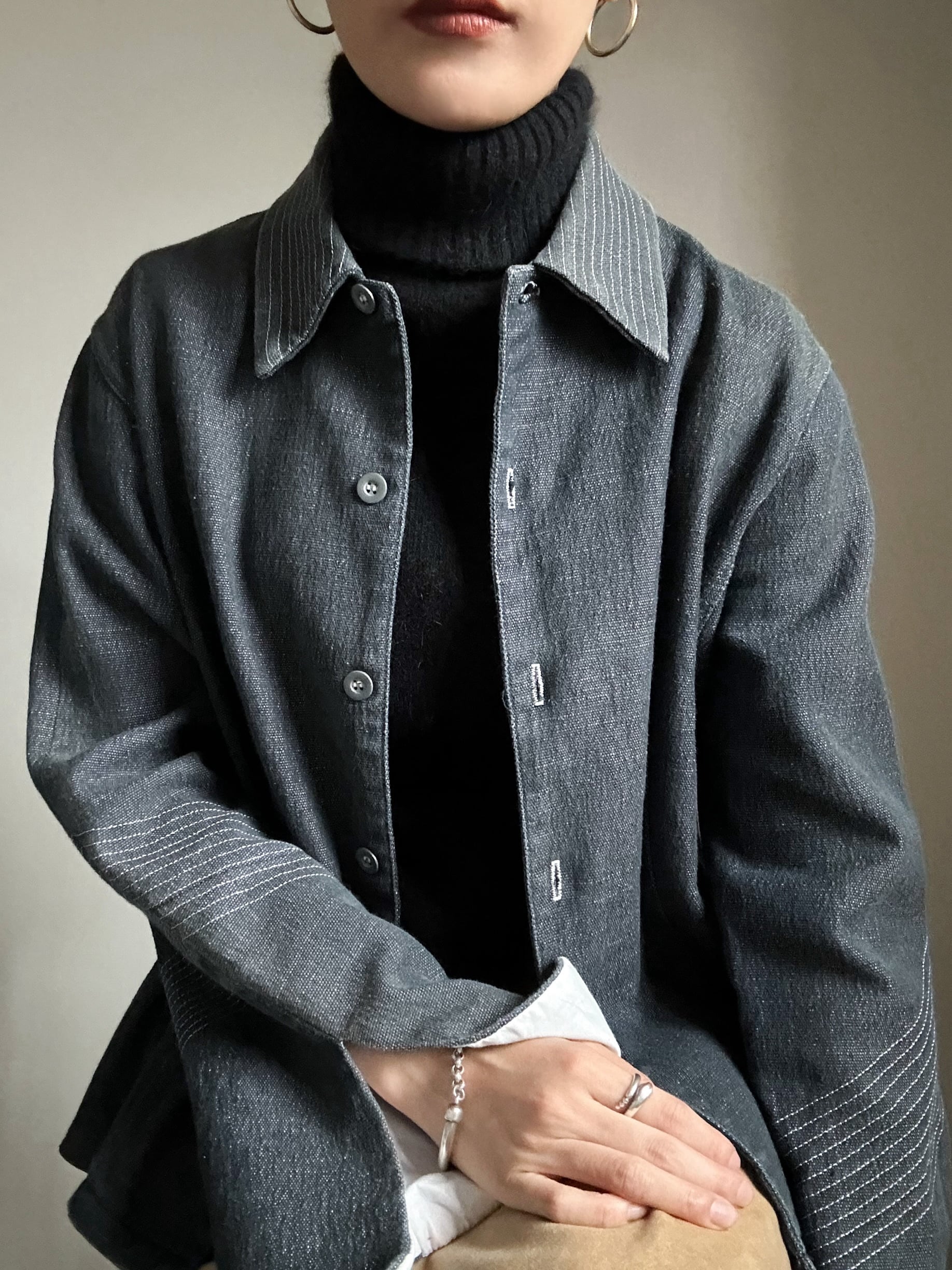 両袖に深めのスリットが入っており、着丈はジャストサイズなのに対し、袖丈は少し長め仕様に。スリット効果と相まって手を長く綺麗に魅せてくれます。カラーもブラックデニムを何回もウォッシュして青みが出てきた様な絶妙なカラーで、歳を重ねてもお使い頂ける落ち着きのある大人かわいいデニムジャケットとなっております!